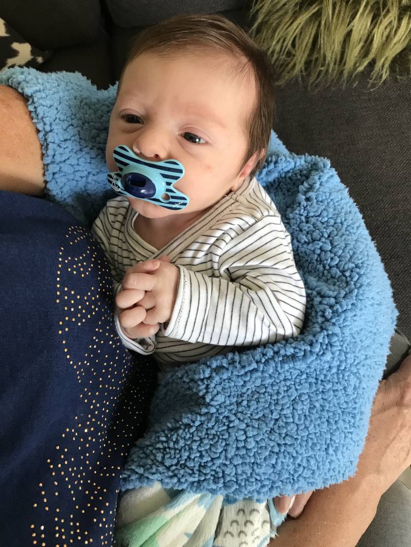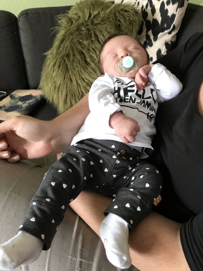 Benjamin had net geslapen en net z’n fles op, dus dat kon het probleem niet zijn. Zijn luier was ook schoon en hij was ook niet met z’n beentjes druk aan het bewegen zoals hij tot nu toe deed als hij krampjes had. Wat kon het dan zijn? Na van alles geprobeerd te hebben deed ik mijn pink in zijn mond en hij begon er op te sabbelen en was direct rustig. Misschien had hij dan zo’n erge zuigbehoefte dat hij daarom niet stil werd. Ik wist alleen niet of hij wel een speen mocht, want dan zou het probleem opgelost zijn. Nu ik er achteraf over nadenk denk ik ja, had het gewoon even op google opgezocht. Maar toen dacht ik alleen maar ik moet het aan de kraamzorg vragen, die weet alles! Het probleem was alleen dat zij er de volgende ochtend pas weer zou zijn en ik tot die tijd toch ook niet de hele tijd mijn pink in Benjamins mond kon houden. Na een tijdje viel hij in slaap en ging het weer goed, en toen kwam papa weer thuis. Wij gingen naar bed en daar was Benjamin het dus niet mee eens. Hij is de hele nacht ontzettend onrustig geweest en als ik dan een pink gaf dan was het weer even goed, maar van slapen is het bijna niet gekomen. Totdat de kraamzorg er de volgende ochtend was en zij zei dat wij gewoon een speen hadden mogen geven, daarna hebben wij Benjamin niet meer gehoord! Hij heeft nu nog steeds een speen, maar deze geven wij alleen als hij naar bed gaat, anders kan hij niet slapen. Uiteindelijk willen wij hier natuurlijk zo snel mogelijk vanaf omdat wij niet willen dat zijn tanden naar voren gaan staan, maar wat zijn wij toch ontzettend blij met dat kleine stukje geruststelling!